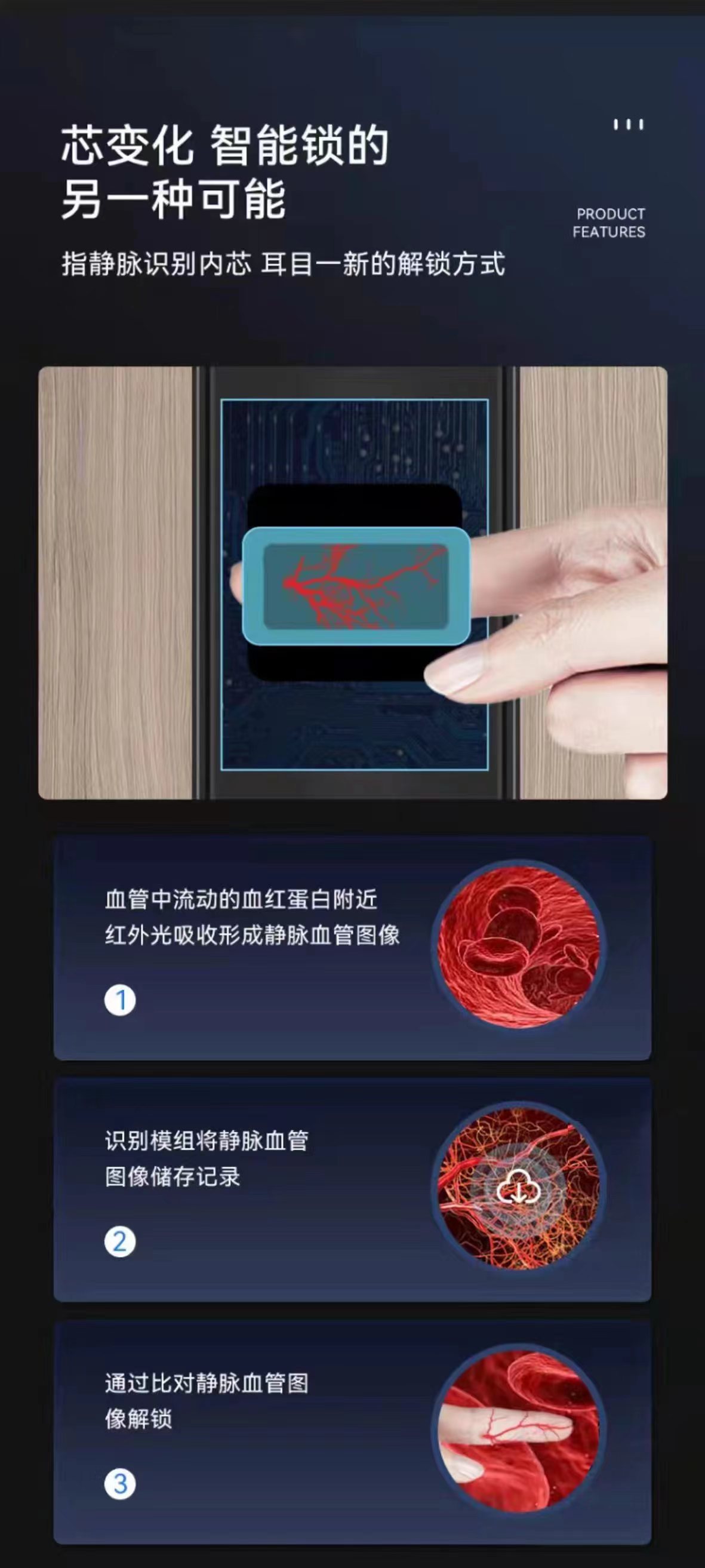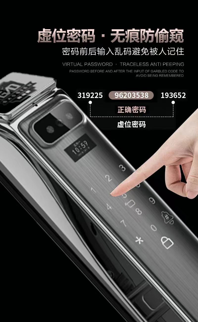 支持指静脉开锁,密码,ic卡,应急钥匙,临时密码,门铃抓拍,可视猫眼,双向视频对讲,远程开锁,防撬报警功能,虚位密码功能,应急电源接口,
