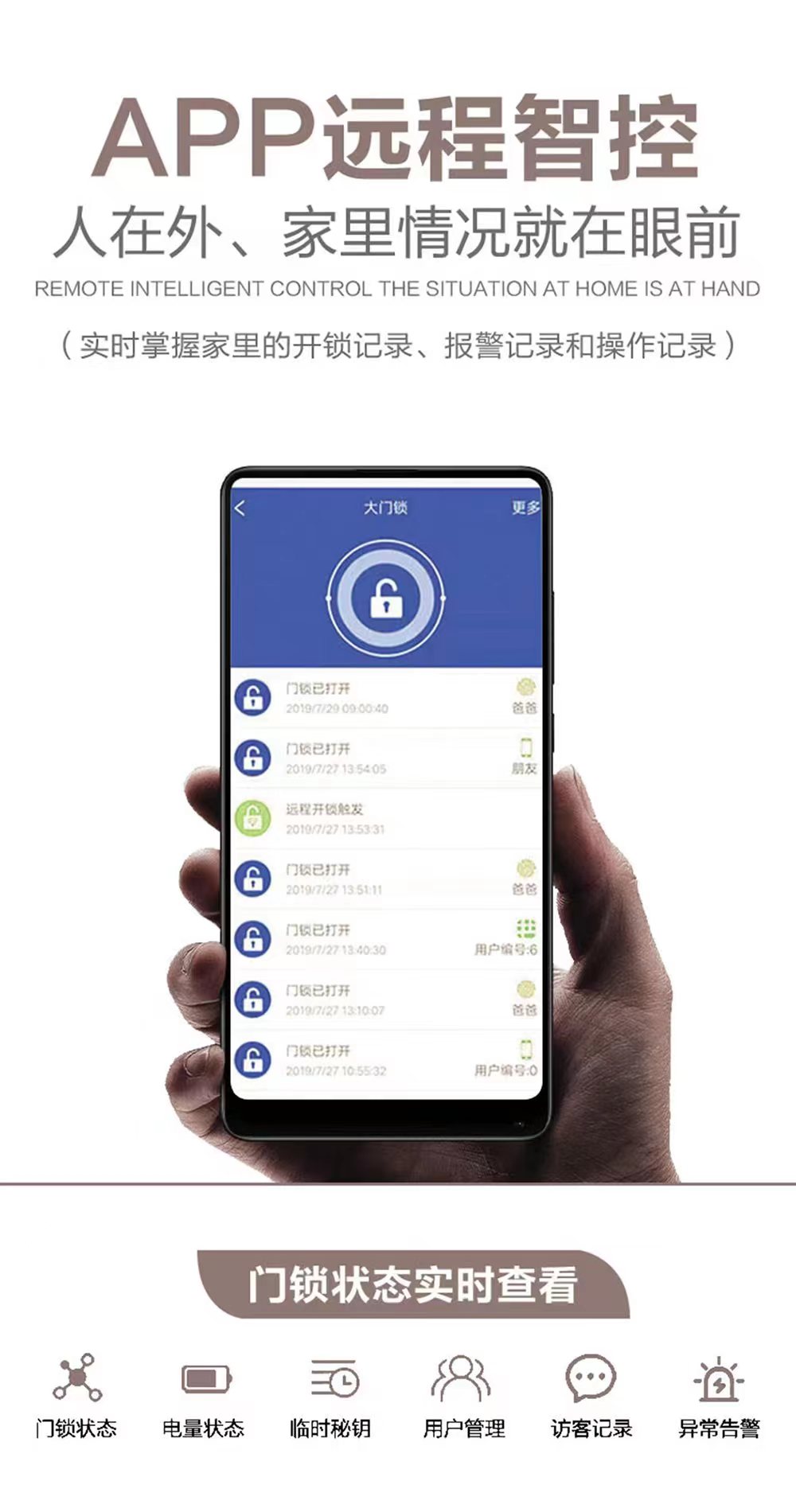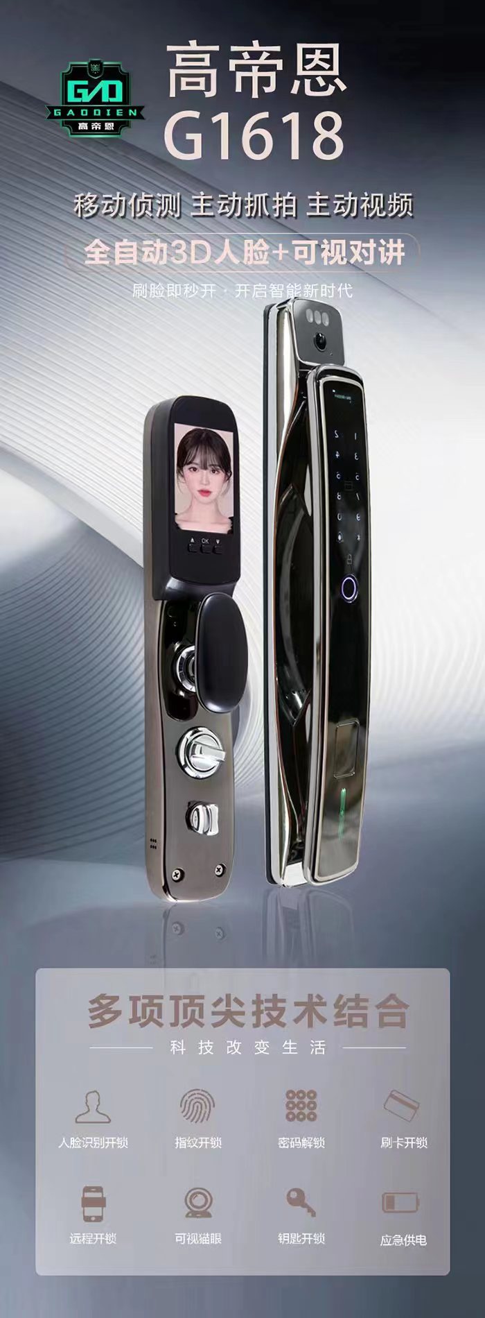 支持人脸识别,指纹,密码,ic卡,应急钥匙,临时密码,门铃抓拍,可视猫眼,远程开锁,视频对讲,防撬报警功能,虚位密码功能,应急电源接口,